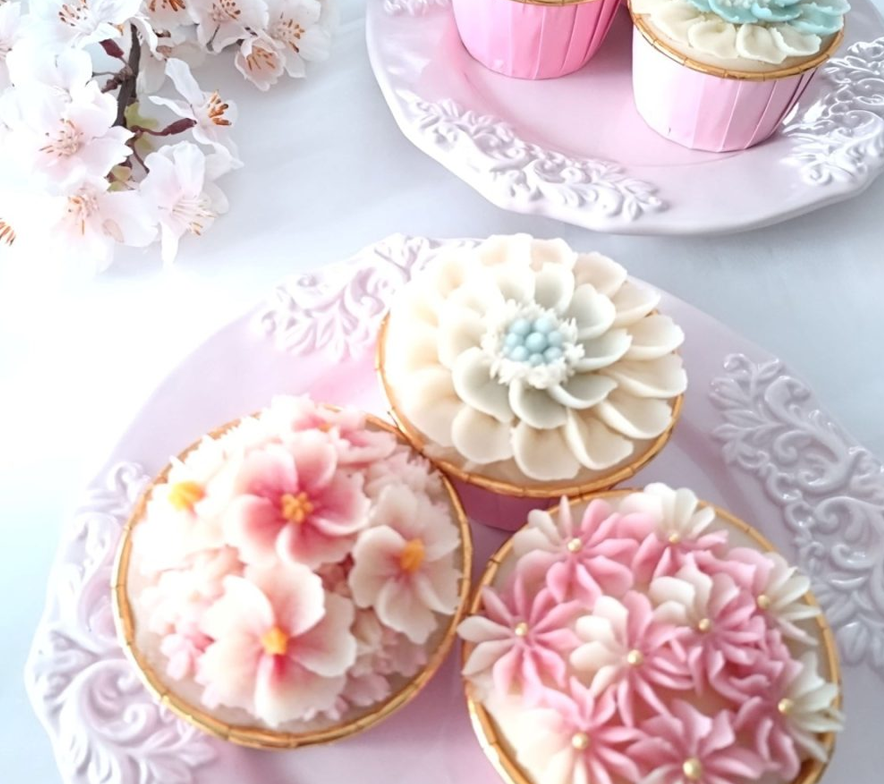 さくらマーガレットデイジー桜吹雪をいっぱいに絞って、プルメリアブランオリジナルのグルテンフリーの米粉のふわふわな浮島に飾ります短時間レッスンです。